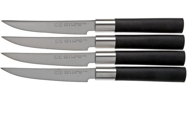 The Kai Wasabi Black steak knife set 6711S is comprised of four steak knives with a blade length of 12 cm. The steak knives are a part of the Wasabi Black collection from Kai. With this collection, these top-quality Kai knives are now also available for a more affordable price.
